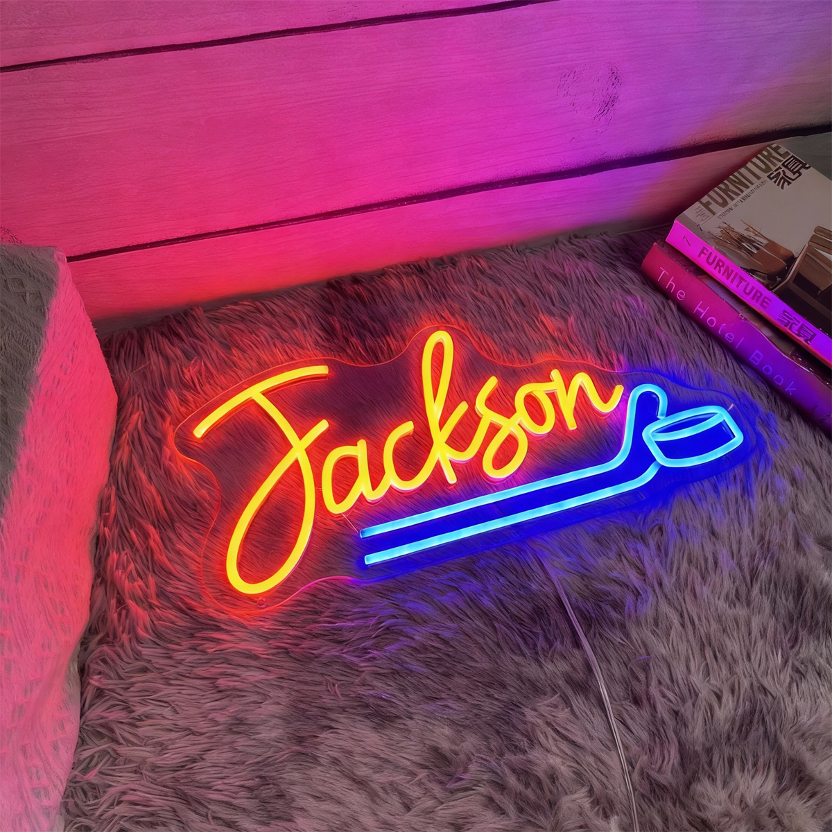 > Neon signs can light up a whole room because they are super illuminating.